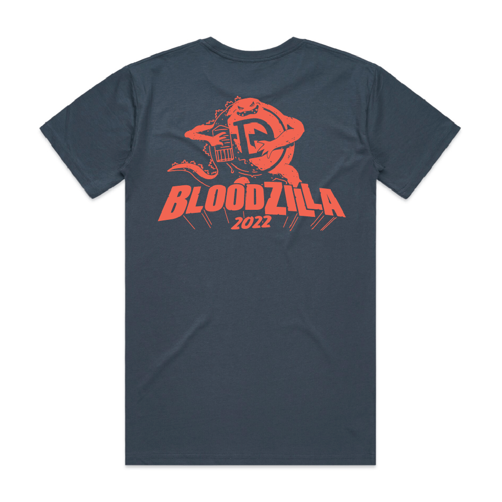 Limited edition Bloodzilla tee. Petrol blue tee with small print on the front & Bloodzilla on the back.